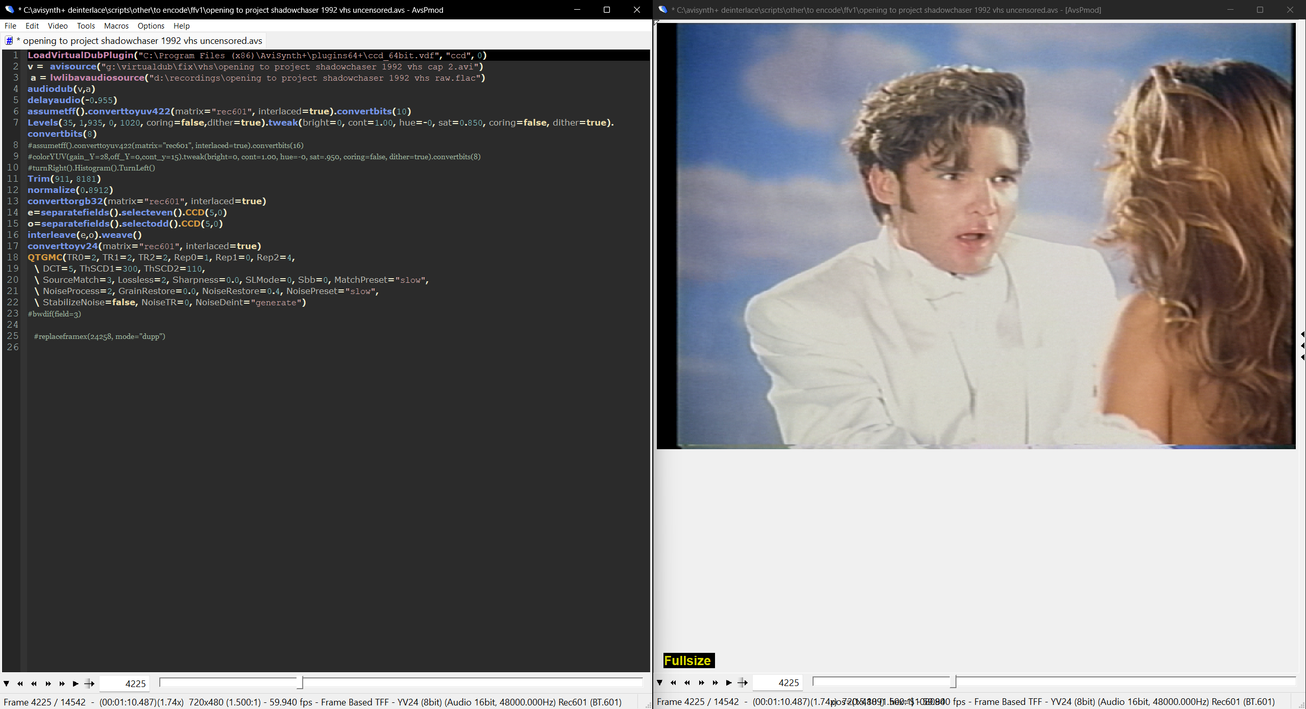 next, i deinterlace with qtgmc. it is by far the best deinterlacer out there. you can tweak the parameters for your liking, to add more detail and such.