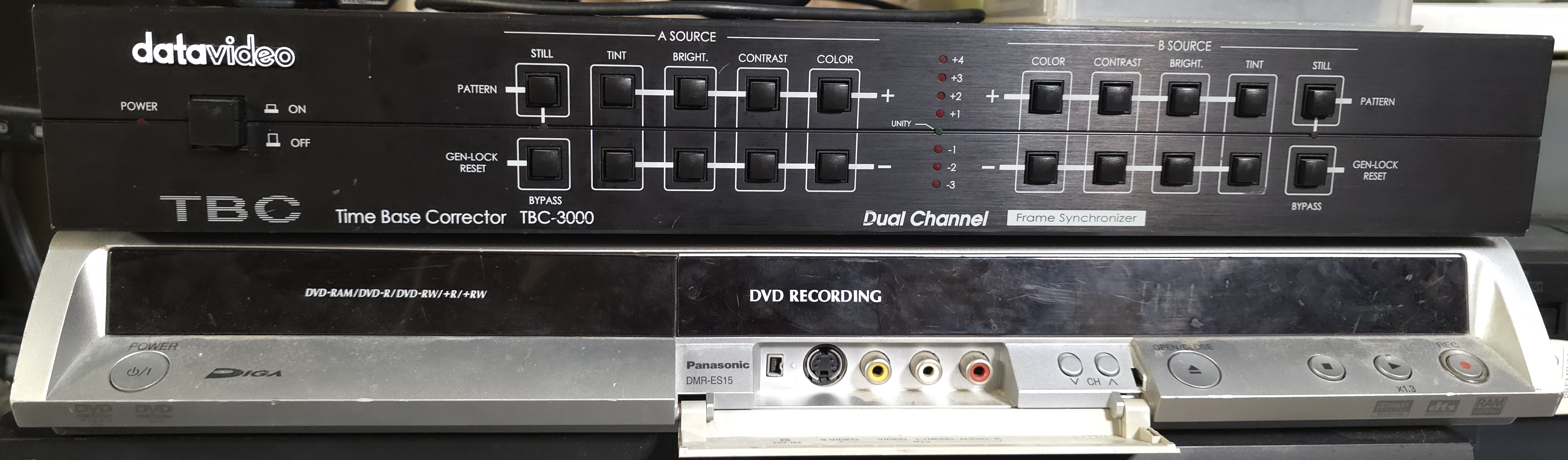 next up, my time base correctors. i have both a datavideo tbc-3000 and a panasonic dmr-es15. i use both regularly. the datavideo is a frame synchronizer, which means that it outputs a stable, constant signal to my capture card. the reason why this is important is because vhs is an unstable signal, so without it, capture cards can drop frames or lose audio sync. but unfortunately these are really expensive. like unobtainably expensive. my unit costed $3,000. HOWEVER, it was a birthday gift from a friend of mine. it wasn't my money ;)
